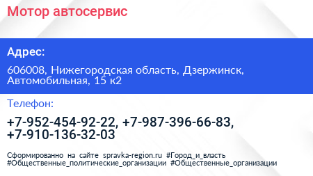 Мотор, автосервис по адресу 606008, Нижегородская область, Дзержинск, Автомобильная, 15 к2 в дальнейшем Организация, размещена в следующих категориях:
