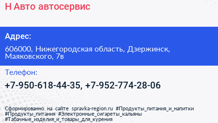 Н-Авто, автосервис по адресу 606000, Нижегородская область, Дзержинск, Маяковского, 7в в дальнейшем Организация, размещена в следующих категориях: