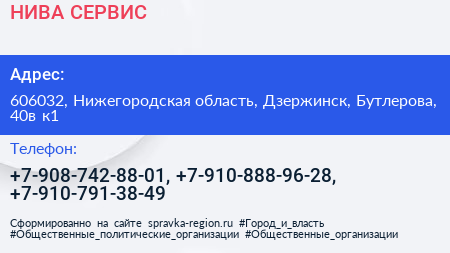 НИВА СЕРВИС по адресу 606032, Нижегородская область, Дзержинск, Бутлерова, 40в к1 в дальнейшем Организация, размещена в следующих категориях: