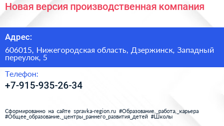 Новая версия, производственная компания по адресу 606015, Нижегородская область, Дзержинск, Западный переулок, 5 в дальнейшем Организация, размещена в следующих категориях: