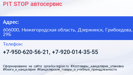 PIT-STOP, автосервис по адресу 606000, Нижегородская область, Дзержинск, Грибоедова, 29Б в дальнейшем Организация, размещена в следующих категориях: