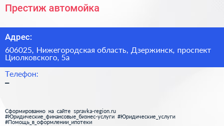 Престиж, автомойка по адресу 606025, Нижегородская область, Дзержинск, проспект Циолковского, 5а в дальнейшем Организация, размещена в следующих категориях: