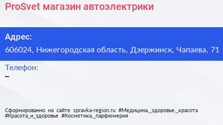ProSvet, магазин автоэлектрики по адресу 606024, Нижегородская область, Дзержинск, Чапаева, 71 в дальнейшем Организация, размещена в следующих категориях:
