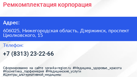 Ремкомплектация, корпорация по адресу 606025, Нижегородская область, Дзержинск, проспект Циолковского, 15 в дальнейшем Организация, размещена в следующих категориях: