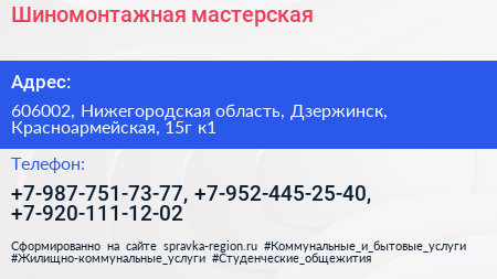 Шиномонтажная мастерская по адресу 606002, Нижегородская область, Дзержинск, Красноармейская, 15г к1 в дальнейшем Организация, размещена в следующих категориях: