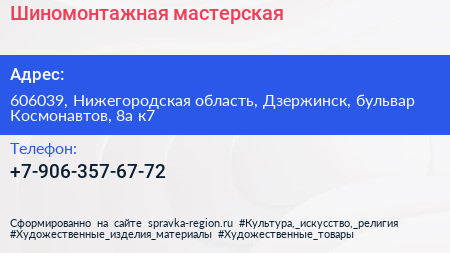Шиномонтажная мастерская по адресу 606039, Нижегородская область, Дзержинск, бульвар Космонавтов, 8а к7 в дальнейшем Организация, размещена в следующих категориях: