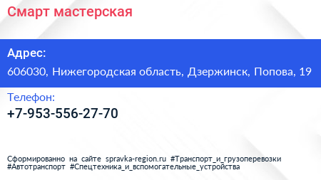 Смарт, мастерская по адресу 606030, Нижегородская область, Дзержинск, Попова, 19 в дальнейшем Организация, размещена в следующих категориях: