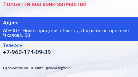 Тольятти, магазин запчастей по адресу 606007, Нижегородская область, Дзержинск, проспект Чкалова, 58 в дальнейшем Организация, размещена в следующих категориях: