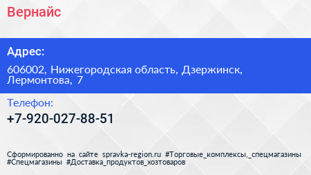 Вернайс по адресу 606002, Нижегородская область, Дзержинск, Лермонтова, 7 в дальнейшем Организация, размещена в следующих категориях: