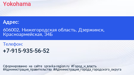 Yokohama по адресу 606002, Нижегородская область, Дзержинск, Красноармейская, 34Б в дальнейшем Организация, размещена в следующих категориях: