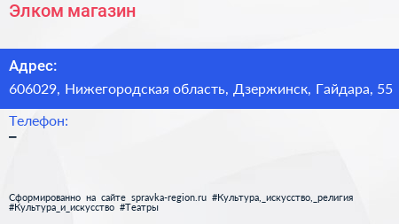 Элком, магазин по адресу 606029, Нижегородская область, Дзержинск, Гайдара, 55 в дальнейшем Организация, размещена в следующих категориях: