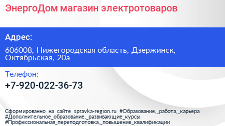 ЭнергоДом, магазин электротоваров по адресу 606008, Нижегородская область, Дзержинск, Октябрьская, 20а в дальнейшем Организация, размещена в следующих категориях: