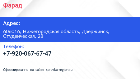 Фарад по адресу 606016, Нижегородская область, Дзержинск, Студенческая, 28 в дальнейшем Организация, размещена в следующих категориях: