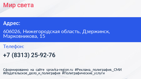Мир света по адресу 606026, Нижегородская область, Дзержинск, Марковникова, 15 в дальнейшем Организация, размещена в следующих категориях: