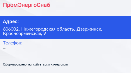 ПромЭнергоСнаб по адресу 606002, Нижегородская область, Дзержинск, Красноармейская, 9 в дальнейшем Организация, размещена в следующих категориях: