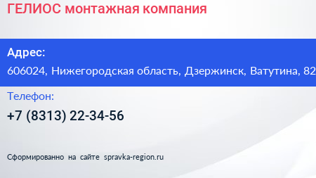 ГЕЛИОС, монтажная компания по адресу 606024, Нижегородская область, Дзержинск, Ватутина, 82 в дальнейшем Организация, размещена в следующих категориях: