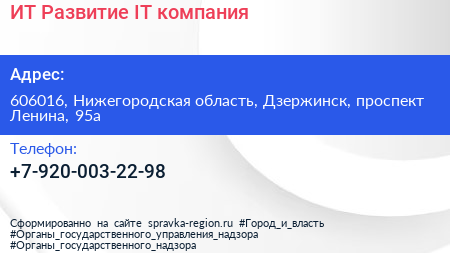 ИТ Развитие, IT-компания по адресу 606016, Нижегородская область, Дзержинск, проспект Ленина, 95а в дальнейшем Организация, размещена в следующих категориях: