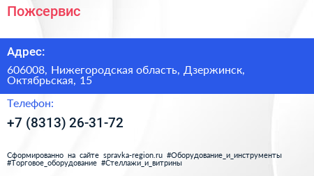 Пожсервис по адресу 606008, Нижегородская область, Дзержинск, Октябрьская, 15 в дальнейшем Организация, размещена в следующих категориях: