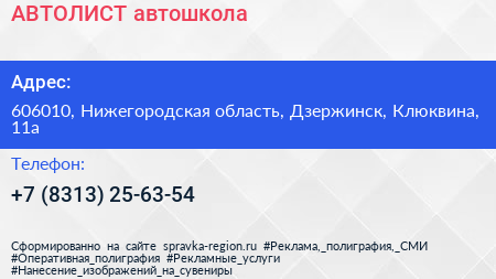 АВТОЛИСТ, автошкола по адресу 606010, Нижегородская область, Дзержинск, Клюквина, 11а в дальнейшем Организация, размещена в следующих категориях: