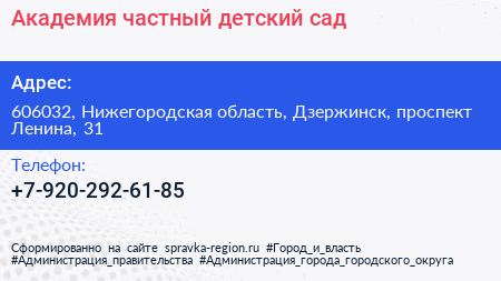 Академия, частный детский сад по адресу 606032, Нижегородская область, Дзержинск, проспект Ленина, 31 в дальнейшем Организация, размещена в следующих категориях: