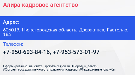 Алира, кадровое агентство по адресу 606019, Нижегородская область, Дзержинск, Гастелло, 18а в дальнейшем Организация, размещена в следующих категориях: