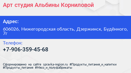 Арт-студия Альбины Корниловой по адресу 606026, Нижегородская область, Дзержинск, Будённого, 7г в дальнейшем Организация, размещена в следующих категориях: