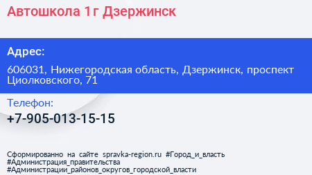 Автошкола №1, г. Дзержинск по адресу 606031, Нижегородская область, Дзержинск, проспект Циолковского, 71 в дальнейшем Организация, размещена в следующих категориях: