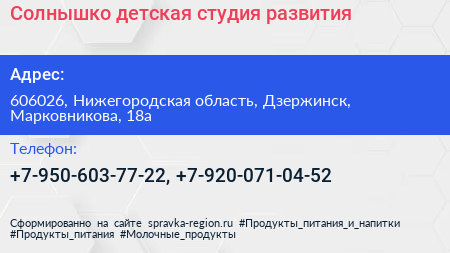 Солнышко, детская студия развития по адресу 606026, Нижегородская область, Дзержинск, Марковникова, 18а в дальнейшем Организация, размещена в следующих категориях: