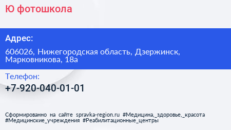 Ю, фотошкола по адресу 606026, Нижегородская область, Дзержинск, Марковникова, 18а в дальнейшем Организация, размещена в следующих категориях: