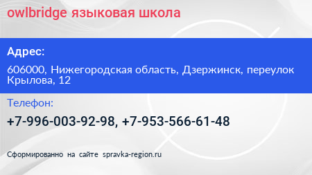 owlbridge, языковая школа по адресу 606000, Нижегородская область, Дзержинск, переулок Крылова, 12 в дальнейшем Организация, размещена в следующих категориях: