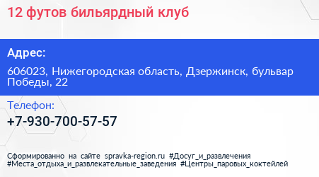 12 футов, бильярдный клуб по адресу 606023, Нижегородская область, Дзержинск, бульвар Победы, 22 в дальнейшем Организация, размещена в следующих категориях: