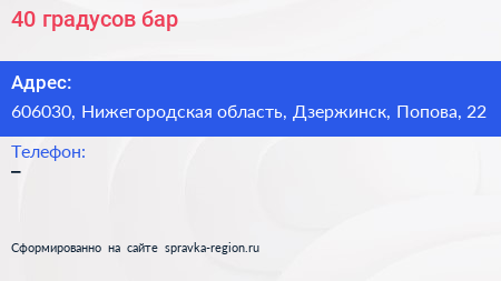 40 градусов, бар по адресу 606030, Нижегородская область, Дзержинск, Попова, 22 в дальнейшем Организация, размещена в следующих категориях: