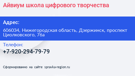 Айвиум, школа цифрового творчества по адресу 606034, Нижегородская область, Дзержинск, проспект Циолковского, 76а в дальнейшем Организация, размещена в следующих категориях: