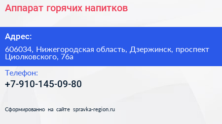Аппарат горячих напитков по адресу 606034, Нижегородская область, Дзержинск, проспект Циолковского, 76а в дальнейшем Организация, размещена в следующих категориях: