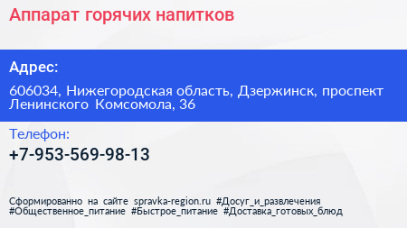 Аппарат горячих напитков по адресу 606034, Нижегородская область, Дзержинск, проспект Ленинского Комсомола, 36 в дальнейшем Организация, размещена в следующих категориях: