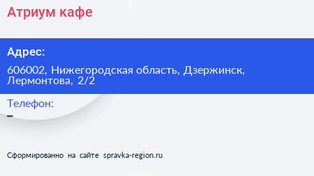 Атриум, кафе по адресу 606002, Нижегородская область, Дзержинск, Лермонтова, 2/2 в дальнейшем Организация, размещена в следующих категориях: