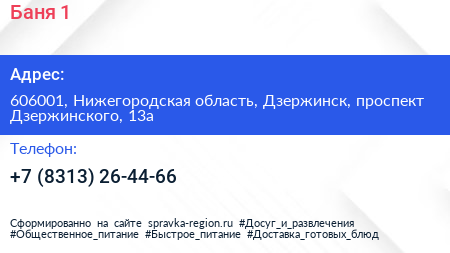 Баня №1 по адресу 606001, Нижегородская область, Дзержинск, проспект Дзержинского, 13а в дальнейшем Организация, размещена в следующих категориях: