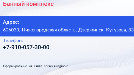 Банный комплекс по адресу 606033, Нижегородская область, Дзержинск, Кутузова, 83 в дальнейшем Организация, размещена в следующих категориях: