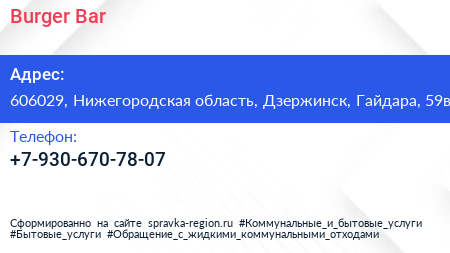 Burger Bar по адресу 606029, Нижегородская область, Дзержинск, Гайдара, 59в в дальнейшем Организация, размещена в следующих категориях: