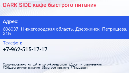 DARK SIDE, кафе быстрого питания по адресу 606037, Нижегородская область, Дзержинск, Петрищева, 31Б в дальнейшем Организация, размещена в следующих категориях: