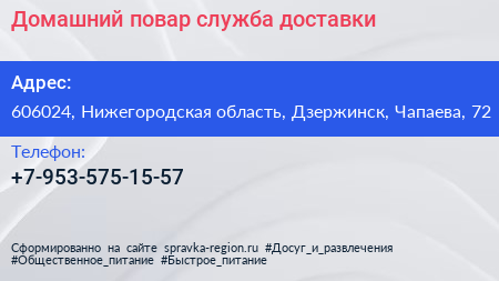 Домашний повар, служба доставки по адресу 606024, Нижегородская область, Дзержинск, Чапаева, 72 в дальнейшем Организация, размещена в следующих категориях: