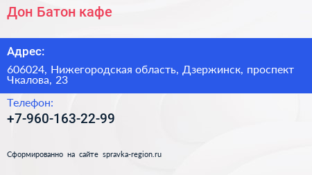 Дон Батон, кафе по адресу 606024, Нижегородская область, Дзержинск, проспект Чкалова, 23 в дальнейшем Организация, размещена в следующих категориях: