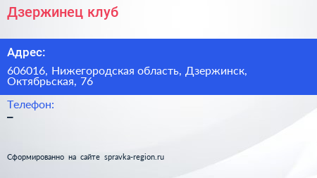 Дзержинец, клуб по адресу 606016, Нижегородская область, Дзержинск, Октябрьская, 76 в дальнейшем Организация, размещена в следующих категориях: