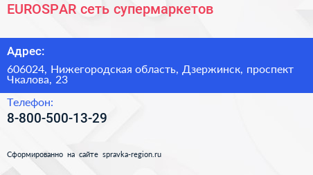 EUROSPAR, сеть супермаркетов по адресу 606024, Нижегородская область, Дзержинск, проспект Чкалова, 23 в дальнейшем Организация, размещена в следующих категориях: