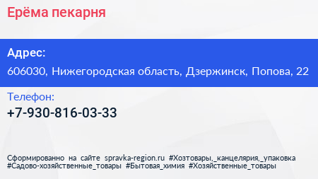 Ерёма, пекарня по адресу 606030, Нижегородская область, Дзержинск, Попова, 22 в дальнейшем Организация, размещена в следующих категориях: