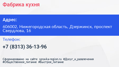 Фабрика-кухня по адресу 606002, Нижегородская область, Дзержинск, проспект Свердлова, 16 в дальнейшем Организация, размещена в следующих категориях: