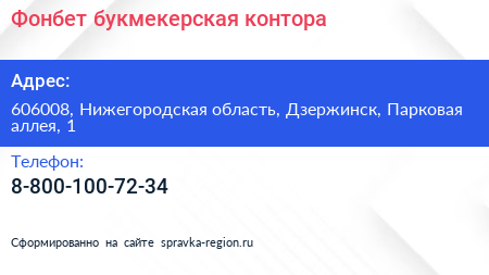Фонбет, букмекерская контора по адресу 606008, Нижегородская область, Дзержинск, Парковая аллея, 1 в дальнейшем Организация, размещена в следующих категориях:
