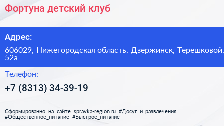 Фортуна, детский клуб по адресу 606029, Нижегородская область, Дзержинск, Терешковой, 52а в дальнейшем Организация, размещена в следующих категориях: