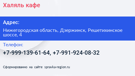 Халяль, кафе по адресу Нижегородская область, Дзержинск, Решетихинское шоссе, 4 в дальнейшем Организация, размещена в следующих категориях: