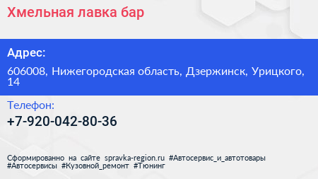 Хмельная лавка, бар по адресу 606008, Нижегородская область, Дзержинск, Урицкого, 14 в дальнейшем Организация, размещена в следующих категориях: